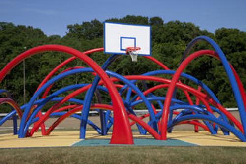 At the entrance of 100 Acres is Los Carpinteros,a sculpture that makes the trajectory of a bouncing basketball.