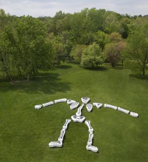 Funky Bones is a group of 20 fiberglass benches emblazoned with depictions of bones that together take the form an enormous, stylized human skeleton.